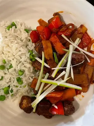 Dish: Kung Pao Pork and Veggie Fried Rice (meat can be substituted- add note when booking)
